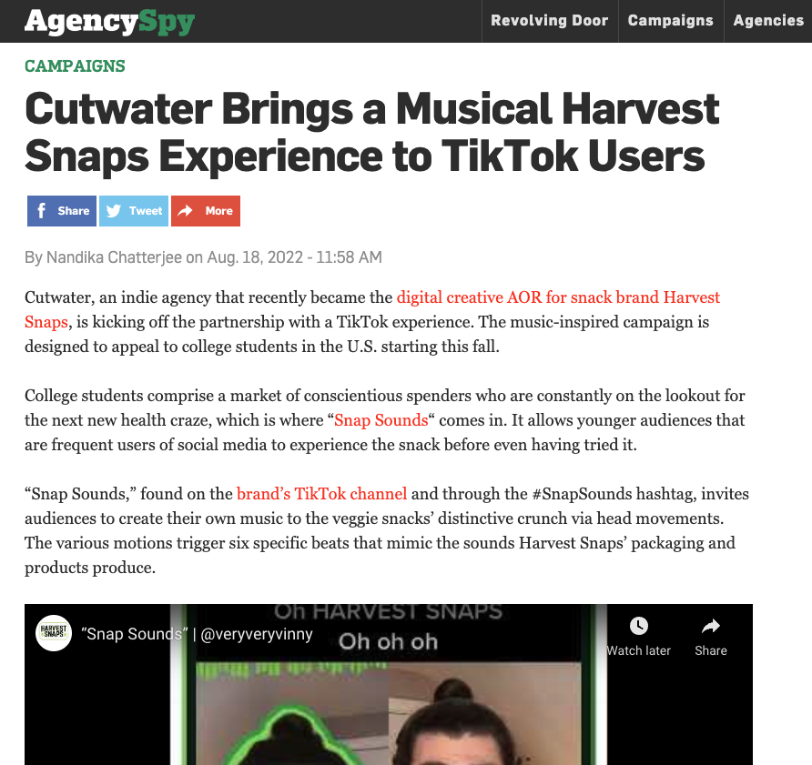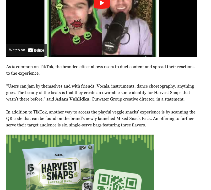 We wanted to harness the power of the Snack Attack by tapping into the undeniable crunch of Harvest Snaps. We created a filter that musicians, content creators and the everyday TikToker could use to make their own unique Snack Attack song with original beats and sound effects along with stickers and graphics.